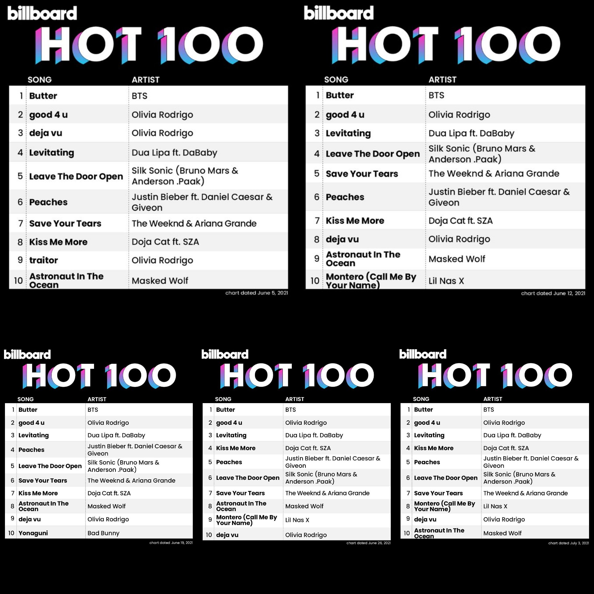 그룹 방탄소년단(BTS)이 두 번째 영어 곡 '버터'로 6월 1일 빌보드 핫샷(HOT SHOT) 데뷔 후 5주 연속 1위를 차지하며 6월 내내 미국서 정상을 지켰다.