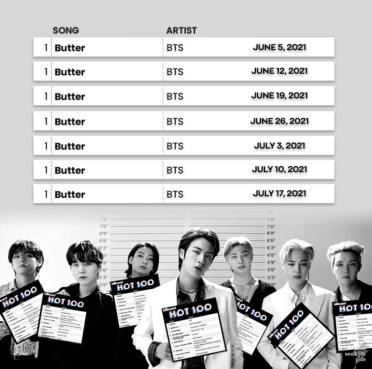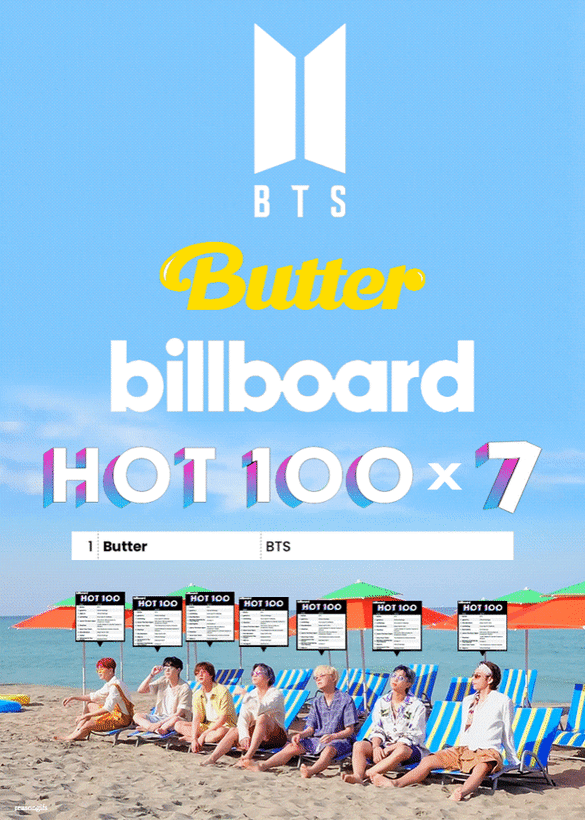 방탄소년단 '버터'가 6월에 이어 7월에도 빌보드 싱글 차트 핫 100 정상을 지켜냈다. 발매하자마자 1위로 차트에 진입한 이후 7주 연속이다. 이로써 버터는 빌보드 사상 핫샷 데뷔한 총 54곡 중에서도 7주 이상 연속 정상을 지킨 8번 째 곡이 됐다. 기록소년단이 자체 기록 경신 중이다. 🎉